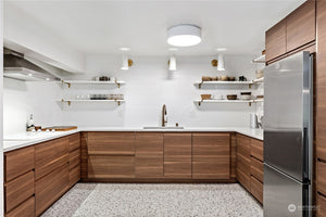 Transform your kitchen and laundry room into a cohesive, contemporary space that exudes style and functionality. This design combines natural textures, bold accents, and modern elements to create an inviting yet sophisticated atmosphere.