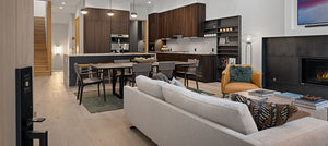 This Nayshn-designed space fuses rich wood cabinetry, sleek stone finishes, and modern furnishings for a cohesive open-concept design. A warm fireplace, curated textures, and thoughtful lighting create a refined yet inviting atmosphere, embodying functional luxury.