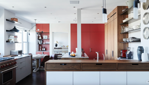 This Nayshn kitchen merges rich wood tones, deep red cabinetry, and sleek modern elements for a striking yet functional space. Minimalist open shelving, sculptural lighting, and warm textures create a refined balance, embodying Nayshn’s bold, purposeful aesthetic.