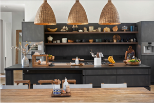 This Nayshn kitchen blends lava stone countertops, charcoal cabinetry, and natural wood for a bold yet inviting space. Woven pendants, open shelving, and a farmhouse table add warmth and function, embodying Nayshn’s timeless, intentional design.